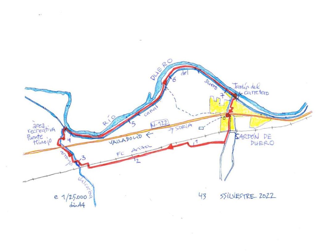 | Marcha 43 SAN SILVESTRE 2022 Sardón de Duero – Camino por la vía del Ferrocarril de Ariza – Camino por el Área recreativa de Puente Hinojo junto al Arroyo de Valcorba – Camino por la Senda del Duero, entre el Rio Duero y el Canal del Duero – Jardín del carretero – Sardón de Duero – 8,31 Km. |  |